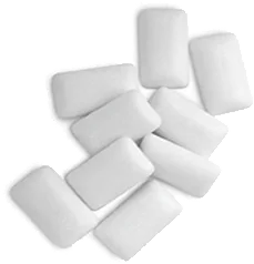 Chewing gum covers a range of products, from stick gum to pellet gum. Many gum bases are naturally tinted an unappealing yellow, brown, or green, not matching the expected refreshing bright whiteness and visual consistency provided by titanium dioxide. For more on panned chewing gum, see panned confections below.