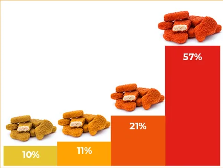 In a large online consumer study, Sensient’s research found that less than one in four consumers chose a low- or no-color version of a breaded nugget or seasoned chip to match the “Xtra Hot n Spicy” flavor positioning.
